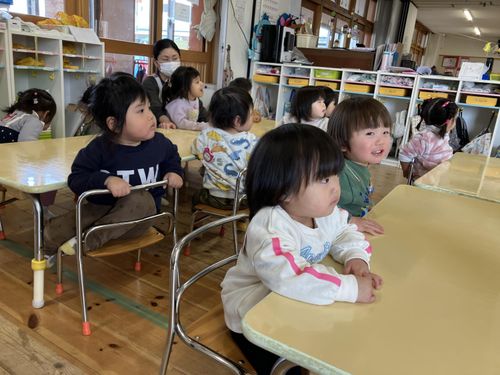 1歳児のお友達、2歳児のクラスになるので今日はお邪魔して椅子に座ったりおもちゃで遊びました。2歳児のお友達は幼稚園の3歳児のクラスへ遊びに行き、一緒に遊んだりトイレを借りました。4歳児は、年長組の卒業式の予行を見てかっこいいなと思いました。😊