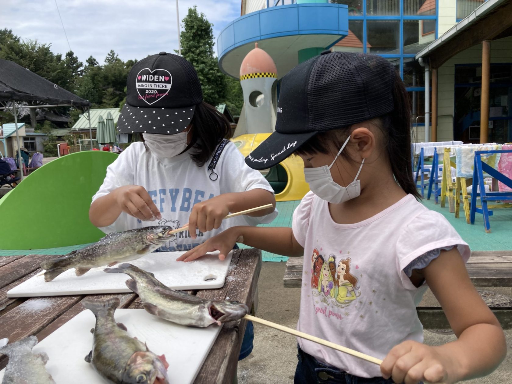 プール泳ぐマスを捕まえ、内臓処理、串打ちも自分たちの手で行い、焼いて食べました。