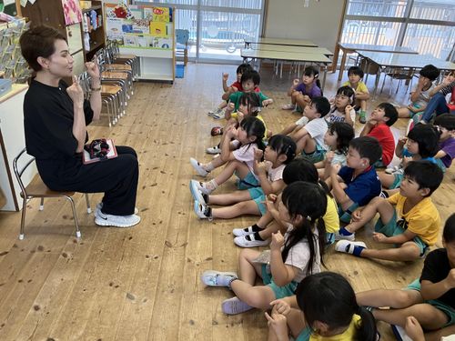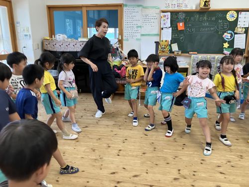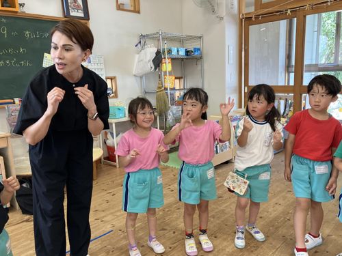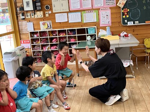 幼児部のクラスは英会話。クリスティーナ先生と一緒に。英語で答えるときは、ちょっぴり恥ずかしがってしまうけどハイタッチは元気に。そして、クリスティーナ先生とのダンスはノリノリで楽しくできました。