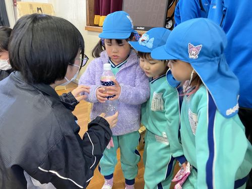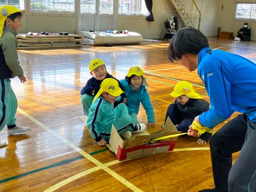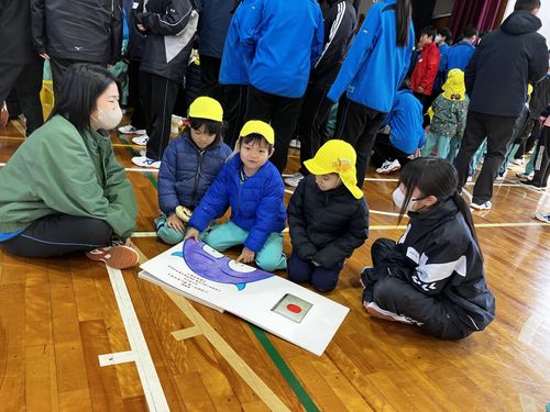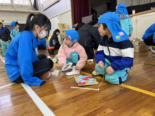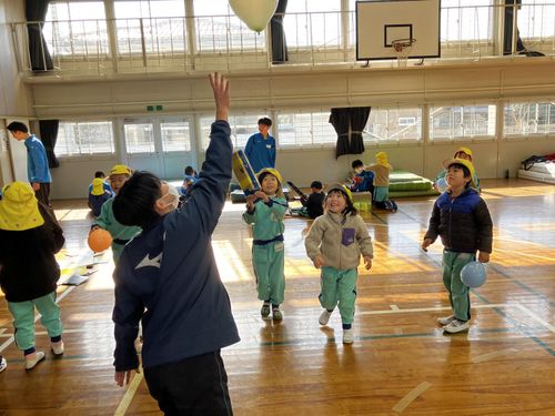 【中村中学校との交流会】 中学校に到着し体育館の大きさにびっくりする子どもたち。大きなお兄さん、お姉さんにも少々緊張気味。でも、遊び出していくうちに、楽しくなり色々なコーナーに行ってお兄さん、お姉さんと関わりだしました。楽しい時間はあっという間。さよならの時間になってしまいました。今回は年長組と年中組。第2弾は年中組と年少組です。