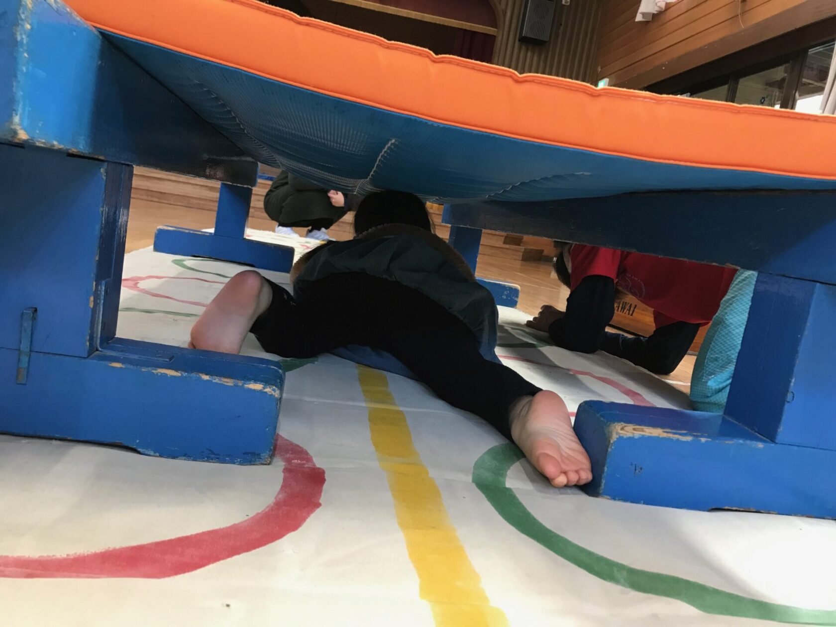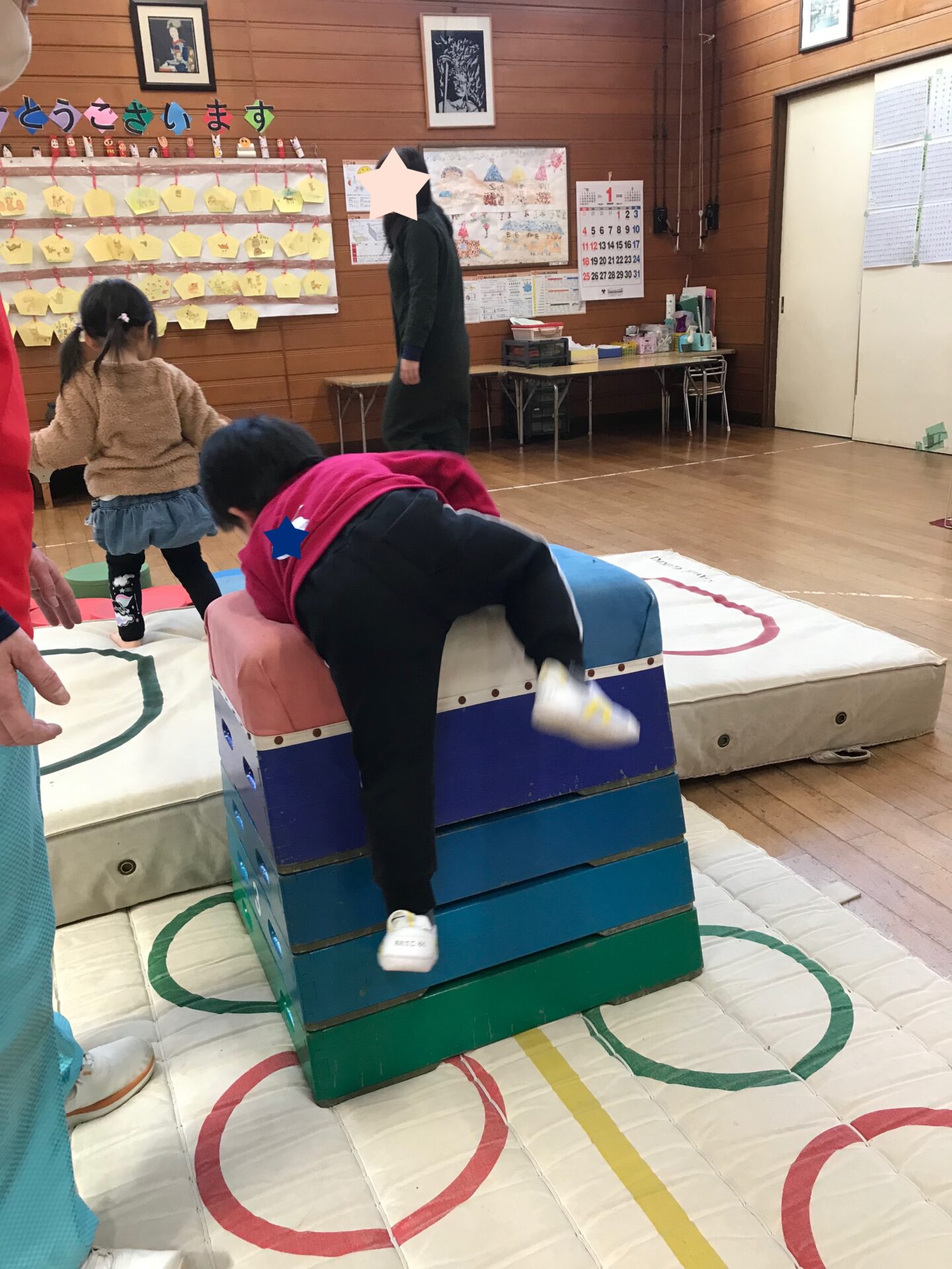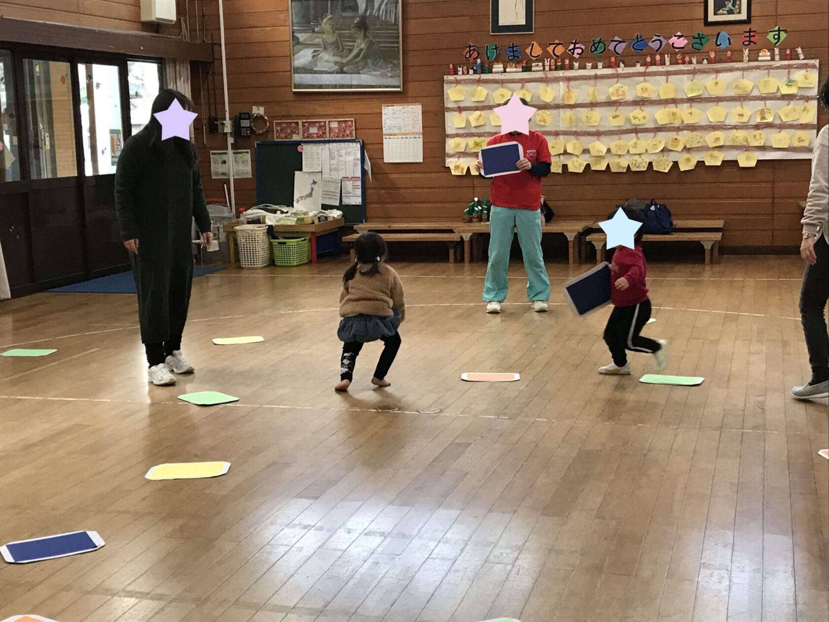 高い跳び箱も、自分の力で登ってジャンプ! 平均台もゆっくり上手に歩いていました☆ 先生が言った色を探すイロオニ。 色の名前を確認しながら、同じ色をたくさん集められましね!