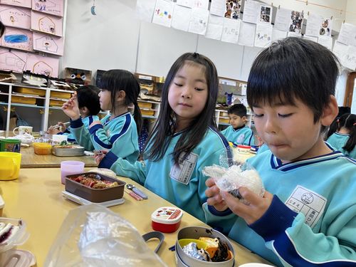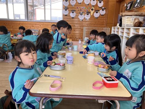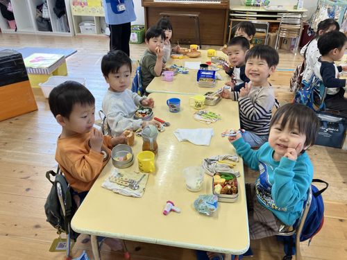 毎月第3火曜日は手作り弁当の日🍱 保護者の方、朝から手作り弁当の準備ありがとうございます。お弁当の時間が待ち遠しい子どもたち。お弁当の蓋を開けると、子どもたちの顔は満面な笑みが、そして「見て僕のお弁当!!」と言って見せてくれました。子ども園の給食も残飯が少なく美味しく食べている様子が伺えます。