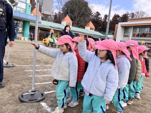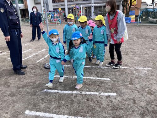 今学期最後の交通安全教室。初めは体育館で交通指導員さん、中村駐在所のおまわりさん、そしてライトくんのお話を聞きました。その後、園庭に出て信号機を使っての実践です。しっかり「右、左、右、よ〜し」で渡る姿が真剣です。ハンドルを握る大人もしっかり交通ルールを守りたいものですね。🚓