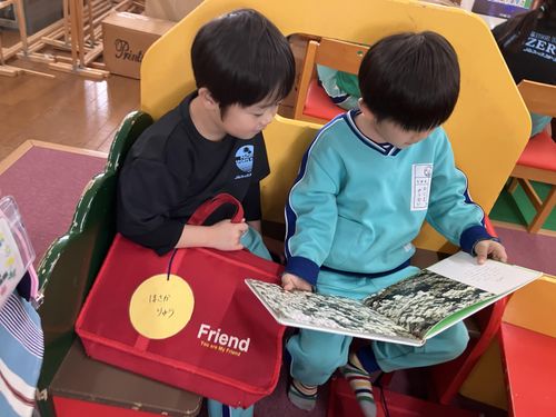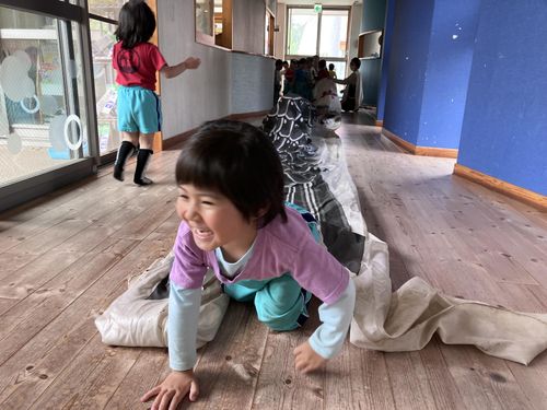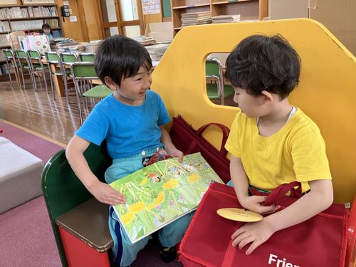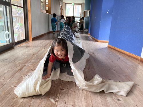 今日はどんなことをしたのかな?はてさて 年長組は、図書室に行って図書貸し出し。その前に、自分の好きな絵本をお友だちと一緒に見ています。 年中組は、大きな鯉のぼりをテラスに置いて、くぐってみました。長い長い鯉のぼりでなかなか出てくるのが大変でした。 年少組は、園庭のひかり山に登ったり、ひかり山の下にあるトンネルをくぐりました。楽しいことがいっぱいです。😊
